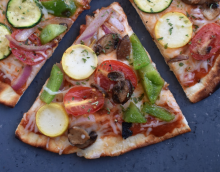 - Remove cooked dough from grill onto a baking sheet or large plate. Top with pizza sauce and cheese. Top with grilled vegetables.