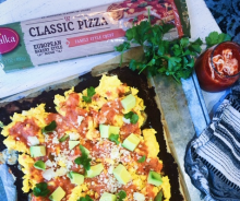 - Meanwhile, whisk eggs with milk and scramble in a wide high sided sauté pan until cooked to your liking. Remove pizza crust from oven and top with scrambled eggs. Stir the yogurt into the sauce and drizzle sauce over the top. Top with remaining Cotija cheese, avocado pieces and fresh cilantro leaves.