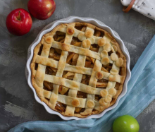 - To make a lattice topping: Cut remaining sheet of pie dough into strips (1" wide, or smaller/larger as desired). Arrange half the strips in even parallel lines across the pie. Fold up every other strip at the mid-point of the pie. Next, place the longest remaining strip across the pie, perpendicular to the first strips, and just below where you folded. Fold down the strips. Fold up the alternating pieces of dough about 1" above the last piece of dough. Place another piece of dough, fold down the strips, and repeat until the pie is covered in a lattice pattern. Cut off over-hanging dough, and pinch the ends of the lattice into the bottom piece of dough. If desired, use a small cookie cutter to cut decorations in any remaining pie dough. Wet the bottom of any decorations with a drop of water, and gently press them onto the dough.