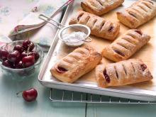 3. Place 1-2 Tbsp. of cherry preserves on one side of each square, and top with cherry halves. Brush dough seams with some water or egg wash. Fold over other half of the dough square, and crimp with a fork. Using a sharp knife cut 5 slits in top of each pastry. Brush all pockets with egg wash.