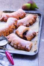 3. Peel and cut the figs into wedges. Distribute evenly on the dough rectangles spread with plum butter. Fold the dough over the filling. Press the edges firmly together with the tines of a fork.