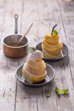 3. Place the braised pears on top of the parchment paper. Wrap a dough strip around each pear from bottom to top like a garland and gently press together at the top.