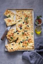 View All Baking Tips 1. Preheat oven to 425°F. Unroll the refrigerated Classic Pizza dough with parchment paper onto a baking sheet. Use your fingers to form slightly raised and fluted edges around the dough sheet. Spread dough with an even layer of cream cheese and season with chili flakes, salt and pepper.
