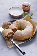 3. Dust your hands with flour, fold the dough over the filling and roll it up. Shape the roll into a ring, place one end to close the other, and press dough firmly together.