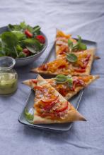 3. Distribute Peperonata evenly over the triangles, leaving a small margin around the edges. Sprinkle each triangle with 1 Tbsp. grated Parmesan.