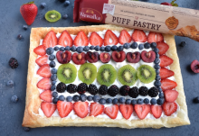 Greek Yogurt Fruit Pizza features a flaky puff pastry crust, vanilla Greek yogurt filling, fresh berries and kiwi for a healthier dessert option that is perfect for any party and ready in just 25 minutes!
